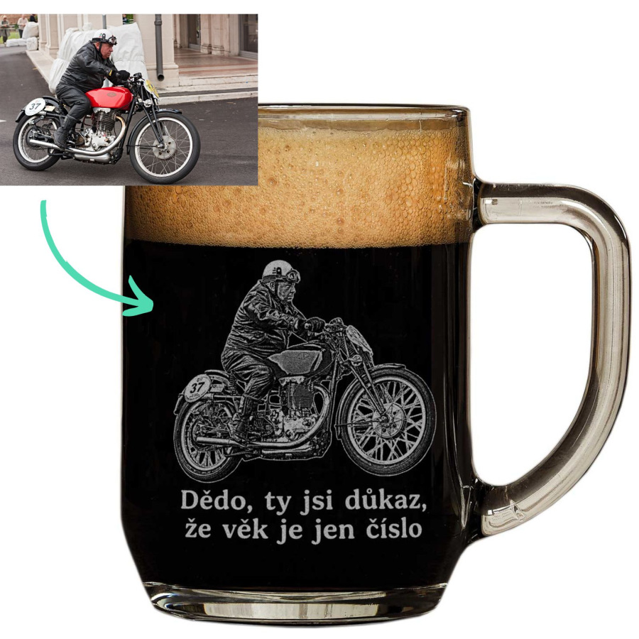 Perfektní dárek pro motorkáře: Půllitr na pivo s fotografií je náš NEJPRODÁVANĚJŠÍ produkt. Na půllitr vygravírujeme zaslanou fotografii, například motorkáře při závodě. Fotografii z doporučujeme na sklenici doplnit textem, výsledek je hezčí, než bez něj. Je jedno, jestli hledáte dárek pro motorkáře k narozeninám, svátku nebo třeba Vánocům, tento půllitr je ideálním řešením.