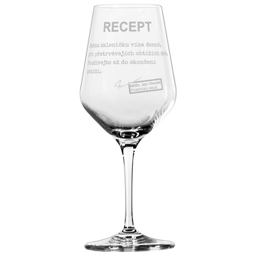 Ideální dárek pro vinaře nebo vinařku: Sklenička na víno o obsahu 35 cl s vygravírovanou grafikou Receptu na víno.